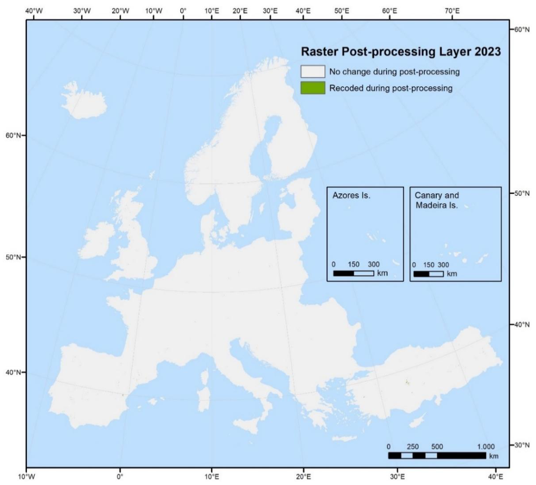 The time window for the Sentinel-2 input data has been shortened from 2 years for the 2018 production (i.e. 2018 ±6 months) to 1.5 years for the 2021 and 2023 productions (i.e. reference year ±3 months) to enable a timelier production that is closer to the actual reference year.