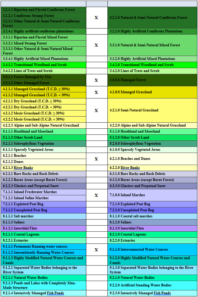 During the 2018 Riparian Zones mapping some Level 4 classes have been merged to the current Riparian Zones nomenclature (v 1.4.1). This is the applicable change matrix: