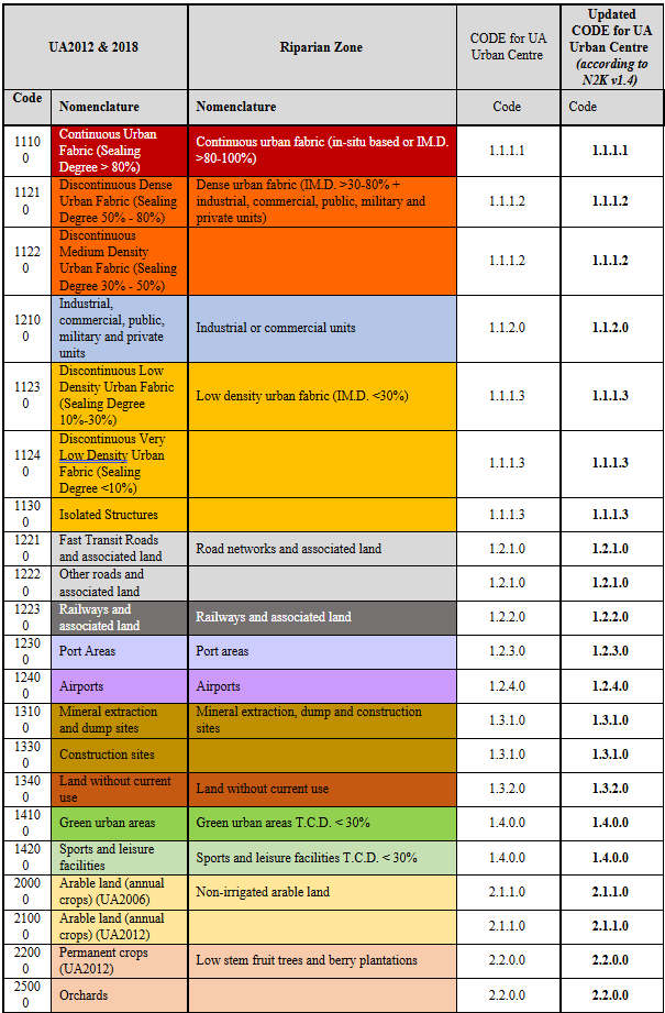 In 2017 and again in 2020, the nomenclature was revised with the aim to harmonize the products of the local components (mainly Riparian Zones and NATURA 2000 products) while maintaining user requirements for both products. The revision and update of the new RZ nomenclature led to a simplification of some classes, decreasing the CODE level 4 in a coherent and non-redundant way (previous nomenclature: 79 classes / new nomenclature: 55 classes).