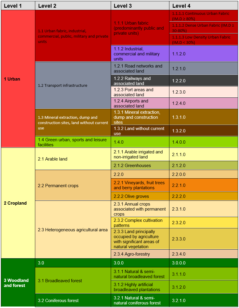 The Nomenclature for the LC/LU dataset is structured into four levels (CODE level 1 to CODE level 4). The LC/LU code levels were designed to correspond to the MAES2 typology of ecosystems.