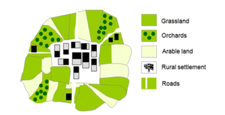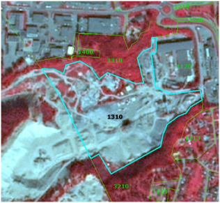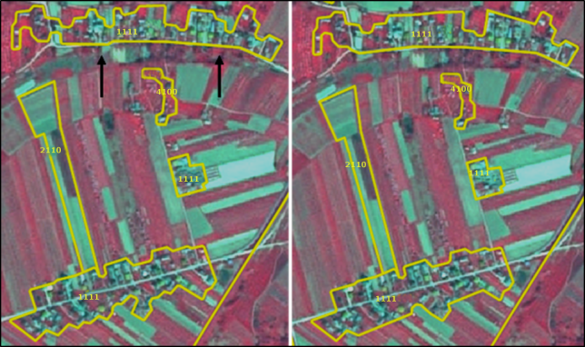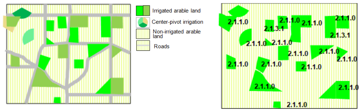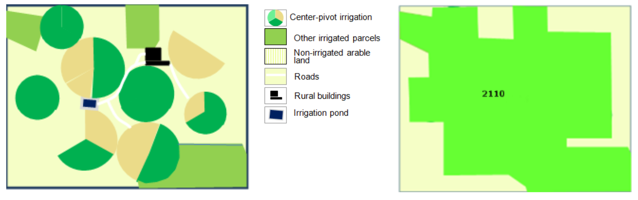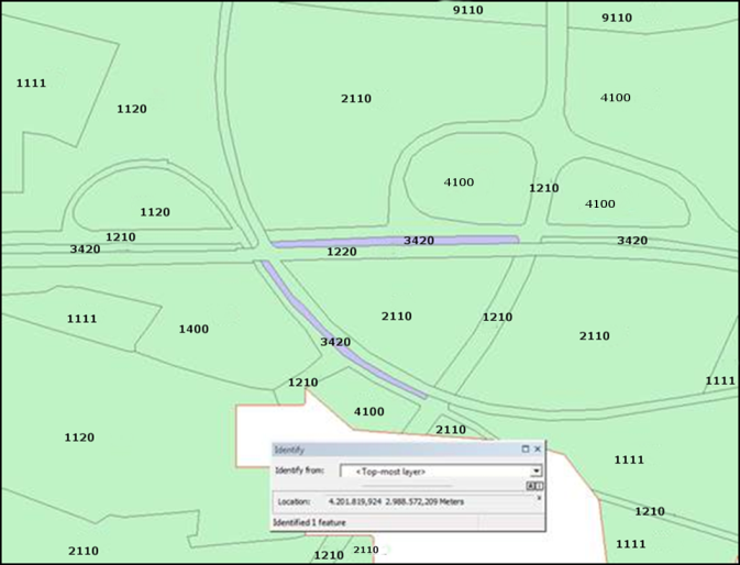 If an object is below the MMU size and completely surrounded by a road or railway network, it shall be aggregated with that surrounding traffic line. However, an exception is made for urban objects. Please see respective definition with Class 1.x.x.x.
