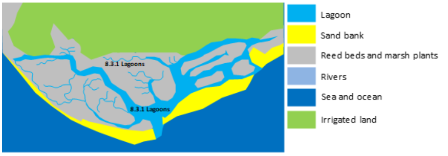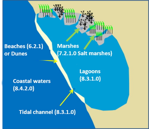Coastal lagoons. Coastal lagoons are areas separated from the sea. These water bodies can be connected to the sea at limited points, either permanently or for parts of the year only → 8.2.1.0 Lagoons.