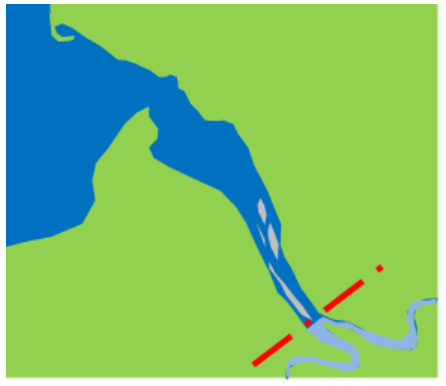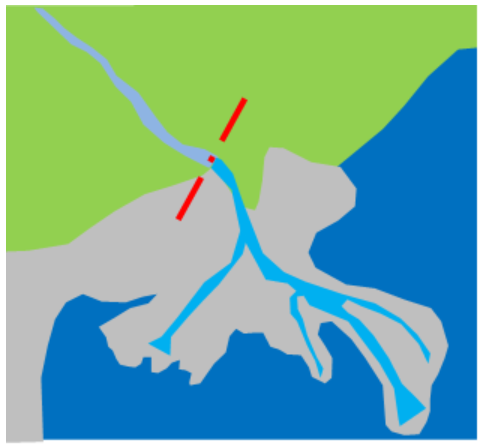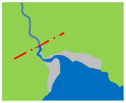 Example: if an artificial canal overlaps a river, the canal is mapped continuously.If objects overlap on the same level, the visually dominant object is mapped continuously. However, if roads and railways meet on the same level, railways are mapped continuously to maintain the railway network.