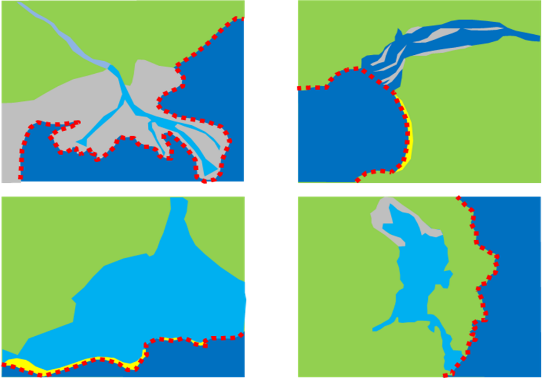National data (coastal line from national supporting data such as topographical maps is used as a support to define the borderline between water courses and coastal sea).