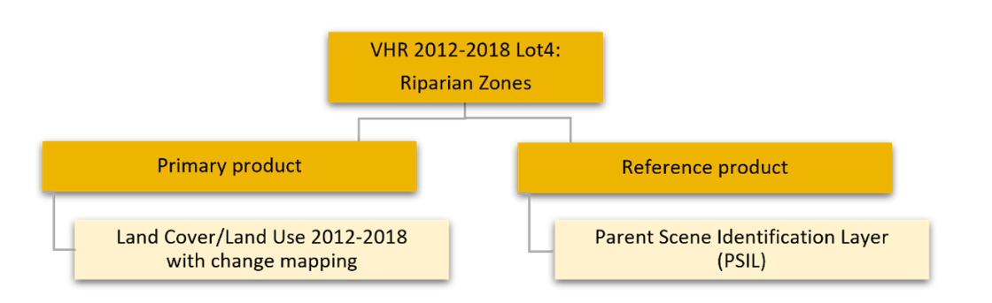Riparian Zones provides a primary product (polygon layer with LU/LC of 2012 and 2018, including change mapping information) and an additional polygon layer providing information of the main EO data input used for generating the map production (Parent Scene Identification Layer (PSIL).