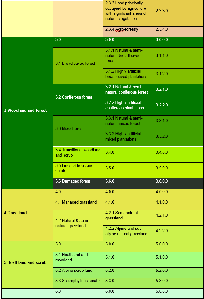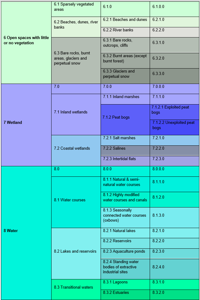 In 2017, the nomenclature was revised with the aim to harmonize the Local Component products (mainly Riparian Zones, Natura 2000, Urban Atlas, and Coastal Zones products) while maintaining user requirements for products. The nomenclature of the RZ data is based on the MAES systematics and is reflected in the CODE values of the data The revision and update of the new Riparian Zones (RZ) nomenclature led to a simplification of some classes, decreasing the CODE level 4 of the nomenclature in a coherent and non-redundant way (previous nomenclature: 79 classes / new nomenclature: 56 classes). In 2021, the class codes and class names were reorganized and updated a further time in order to, again, achieve better harmonization of the nomenclatures of the CLMS Local Component products while the number of 56 classes (shown in Table 3) as well as the class definitions were maintained.