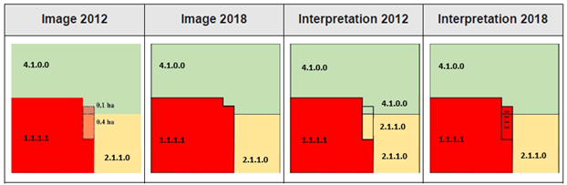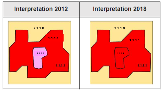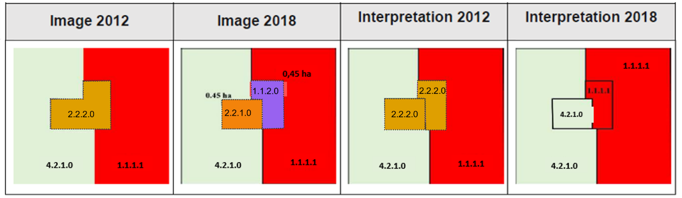 LU/LC 2012-2018 product contains fields with the thematic class corresponding to 2012, 2018 and a change code field indicating the change status for each polygon. These fields allow users to filter and obtain if desired, the specific products as separate layers: LU/LC for 2012, 2018 and a change map displaying the polygons that have changed. These products were produced in European ETRS89 Lambert Azimuthal Equal-Area (LAEA) projection. A more detailed description of the products and the methodology are provided in the next sections.