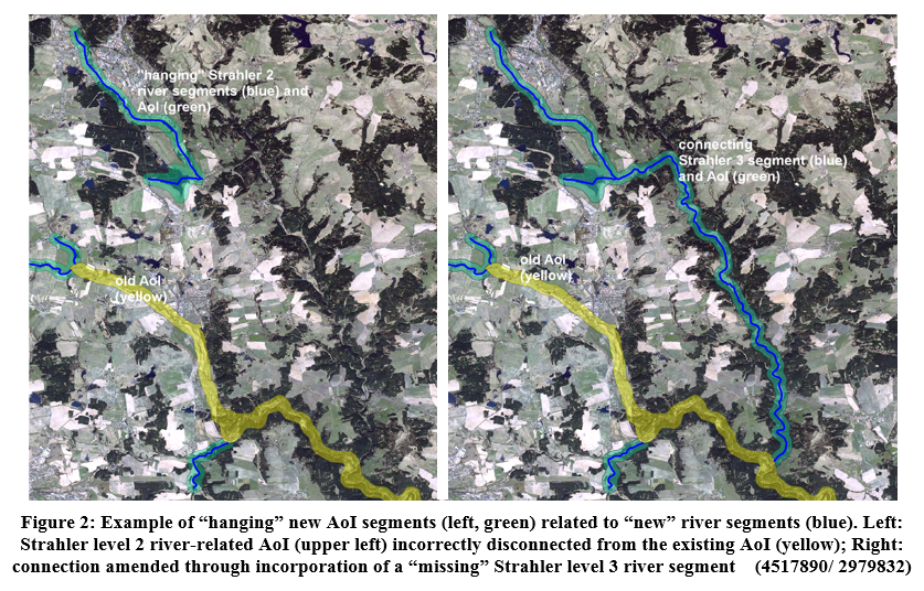 The initial Riparian Zones map was available for more than 550.000 km² of EEA-39 territory and covered modelled buffer areas around selected medium and large size rivers with Strahler [4] numbers from 3–8. The mapping was done for the reference year 2012 with a temporal coverage of satellite input data between 2010 and 2014. The production for Strahler from 3-8 was finalized in 2015. In 2017/2018 a geographic extension covering buffered (250 m) rivers with Strahler number 2 was performed, extending the total area to 805.177 km², and including the implementation of the newest version of EU-Hydro (public beta 0.9) that led to minor reclassification of larger rivers to Strahler level 9.