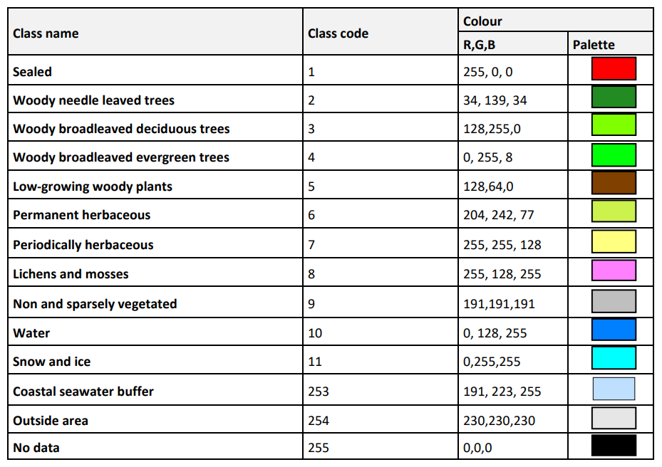 Table 2: Thematic raster classes of CLCplus Backbone 2023, their class codes and colours