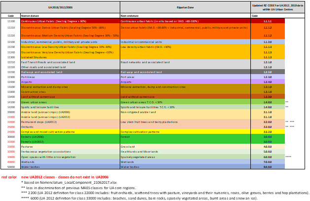 In 2017, the nomenclature was revised with the aim to harmonize the Local Component products (mainly Riparian Zones, Natura 2000, Urban Atlas, and Coastal Zones products) while maintaining user requirements for products. The nomenclature of the RZ data is based on the MAES systematics and is reflected in the CODE values of the data The revision and update of the new Riparian Zones (RZ) nomenclature led to a simplification of some classes, decreasing the CODE level 4 of the nomenclature in a coherent and non-redundant way (previous nomenclature: 79 classes / new nomenclature: 56 classes). In 2021, the class codes and class names were reorganized and updated a further time in order to, again, achieve better harmonization of the nomenclatures of the CLMS Local Component products while the number of 56 classes (shown in Table 3) as well as the class definitions were maintained.