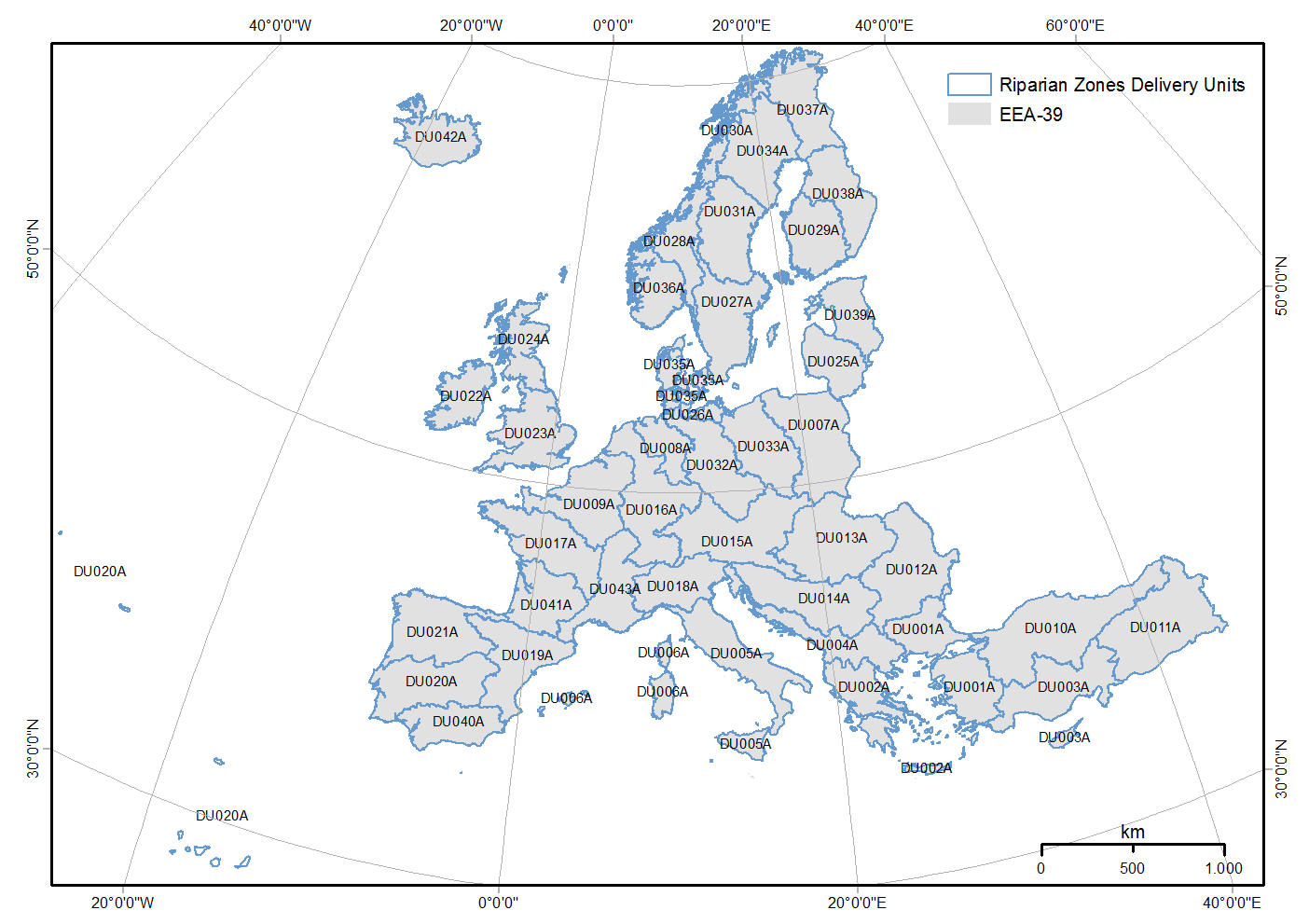 The LC/LU data is delivered in 43 single Delivery Units (DUs) based on aggregated sub-basins of EEA’s European Catchment and Rivers Network System (ECRINS v1.1), clipped either to the Geographical Information System of the Commission (GISCO) boundaries in scale 1:100,000 or to the shoreline from EU-Hydro database.